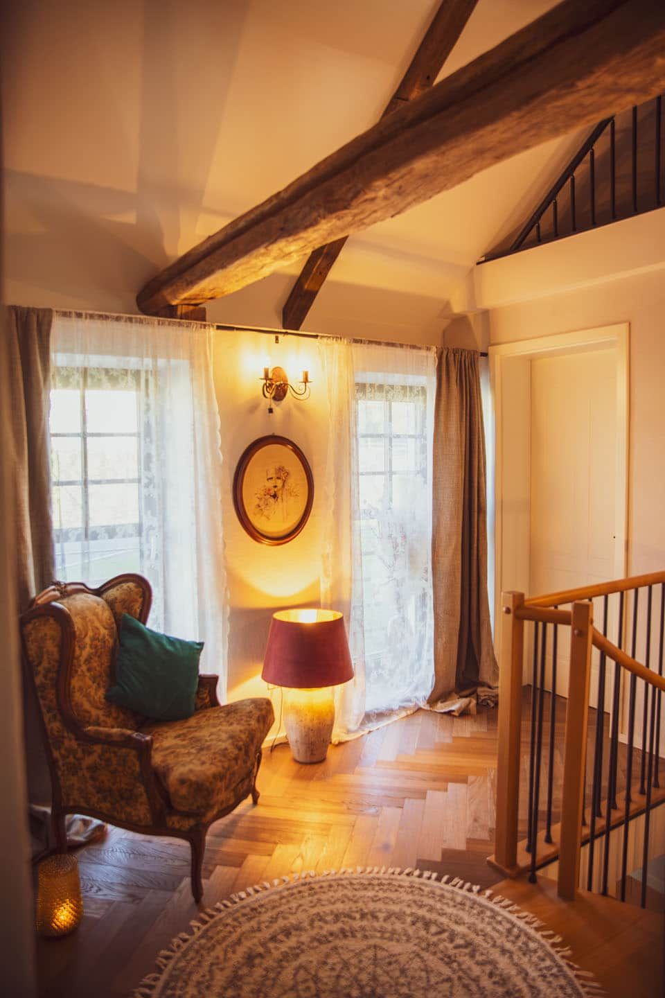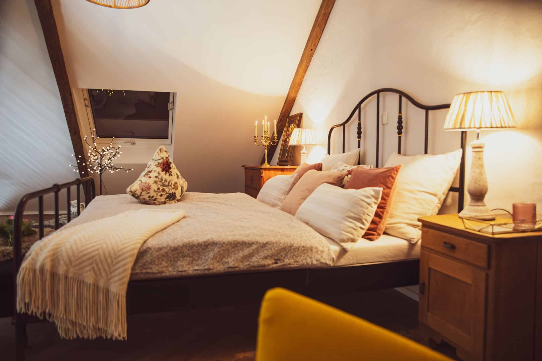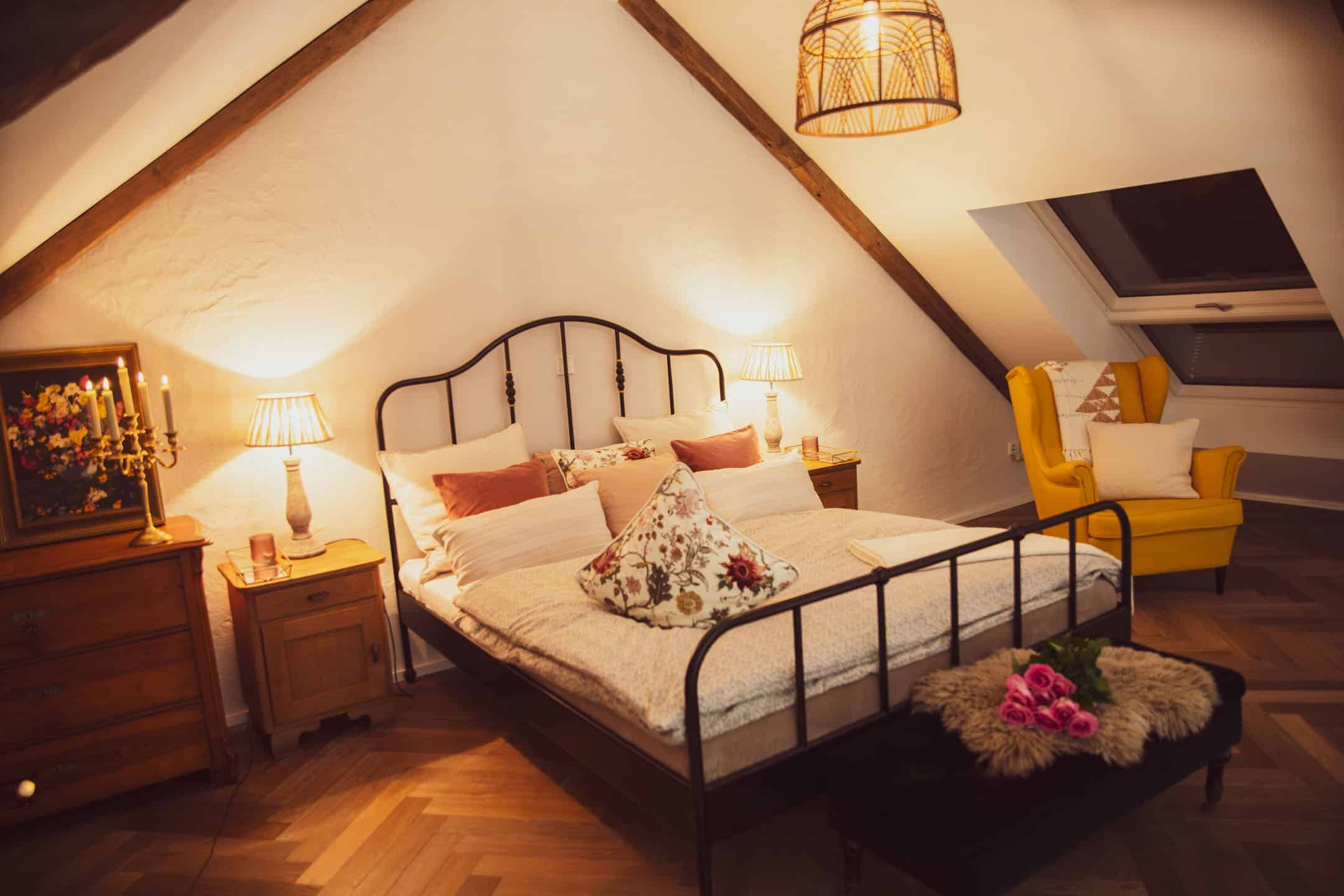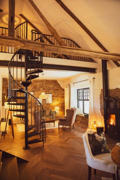 Nutzen Sie die Wendeltreppe, um von dort wiederum direkt unterm „Heubodendach“ mit Blick durchs Fenster auf die Sterne einzuschlafen!