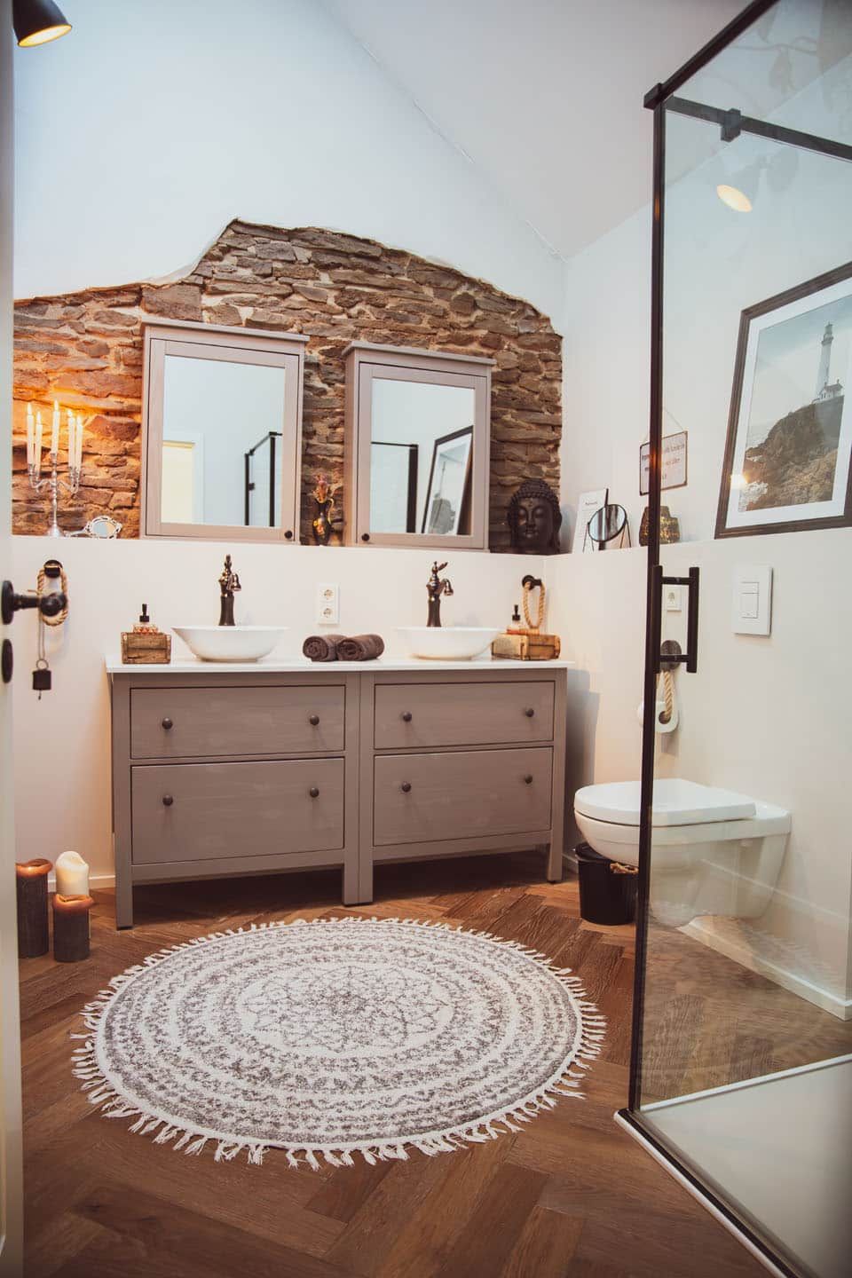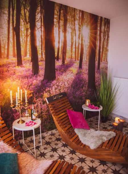 Die Suite ist in insgesamt drei Wohnbereiche aufgeteilt, die mit Wendeltreppen von unten nach oben verbunden sind. Im unteren Bereich entspannen Sie in der Infrarot-Kombi-Sauna und nehmen im Anschluss im Bad eine kühle Dusche.