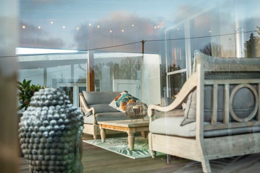 Vom Wohn- und Essbereich oder aber auch aus dem Sauna-Haus haben Sie den Zugang zur 40 qm großen, überdachten Terrasse mit separat gelegenem Außenwhirlpool.