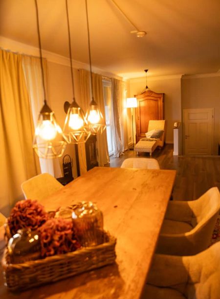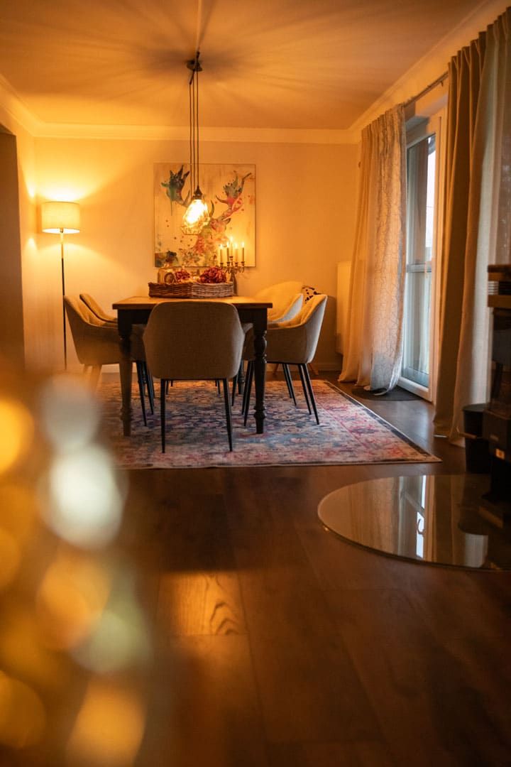 Der Blick von Ihrem Frühstückstisch aus dem Esszimmer lässt Sie direkt morgens schon bei einer warmen Tasse Kaffee oder Tee mit dem Ausblick aufs Panorama in eine andere Welt schweben. Auch abends genießen Sie direkt am Ofen beim Feuer Ihren Urlaub.
